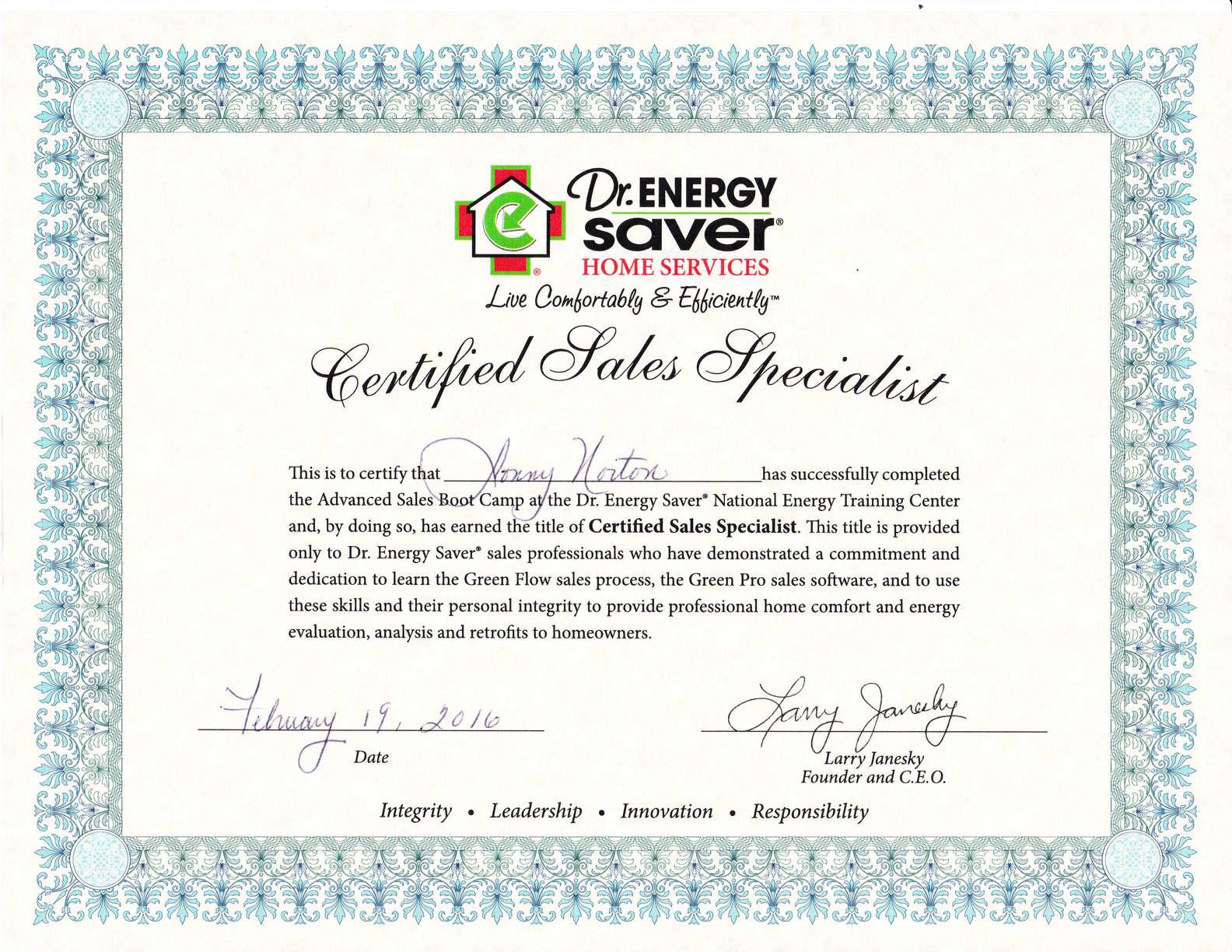 Jonny Norton successfully completed the Advanced Sales Boot Camp at the Dr. Energy Saver National Energy Training Center and, by doing so, has earned the title of Certified Sales Specialist. This title is provided only to Dr. Energy Saver sales professionals who have demonstrated a commitment and dedication to using their skills and personal integrity to provide professional home comfort and energy evaluations, analysis' and retrofits to homeowners.