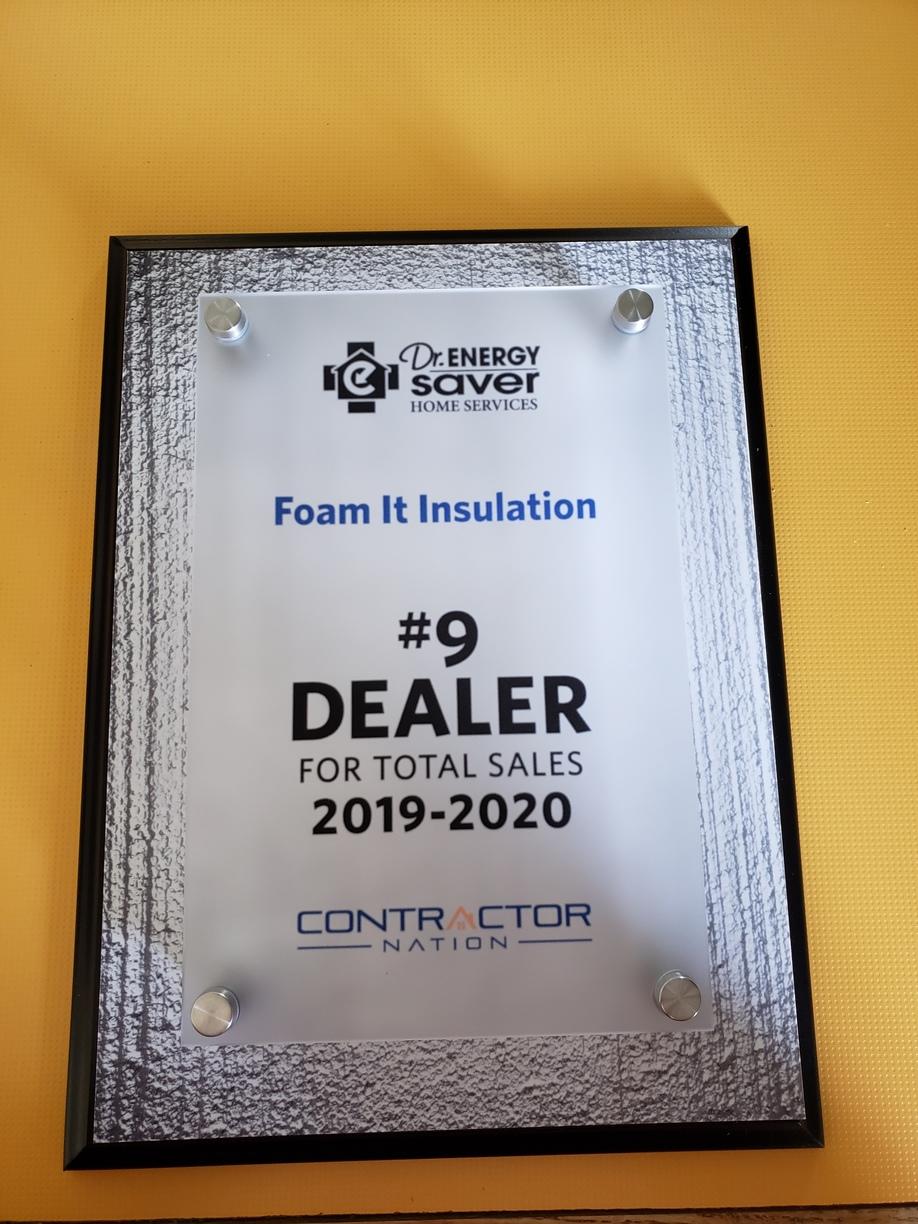 This award was presented to Foam It Insulation for 2019-2020 sales. We were in the top 10 for Dealer Total Sales for Doctor Energy Saver, coming in this year at #9!